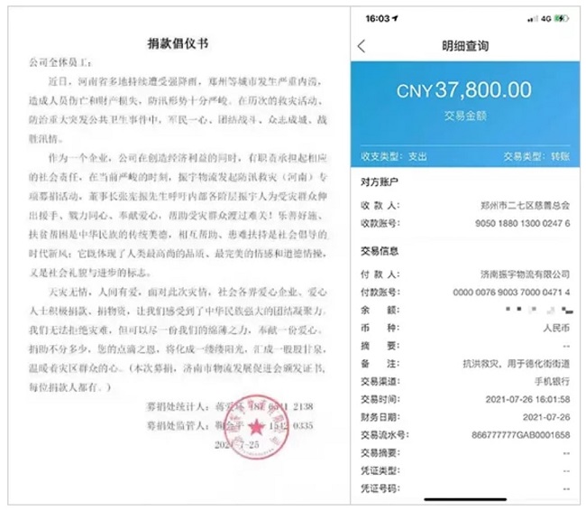 在當(dāng)前嚴(yán)峻的時刻,振宇物流發(fā)起防汛救災(zāi)(河南)專項募捐活動,董事長張憲振先生呼吁振宇人為受災(zāi)群眾伸出援手、戮力同心、奉獻(xiàn)愛心,幫助受災(zāi)群眾渡過難關(guān)!大家慷慨解囊、踴躍捐款,7月25日、26日兩天時間匯集捐款37800元。