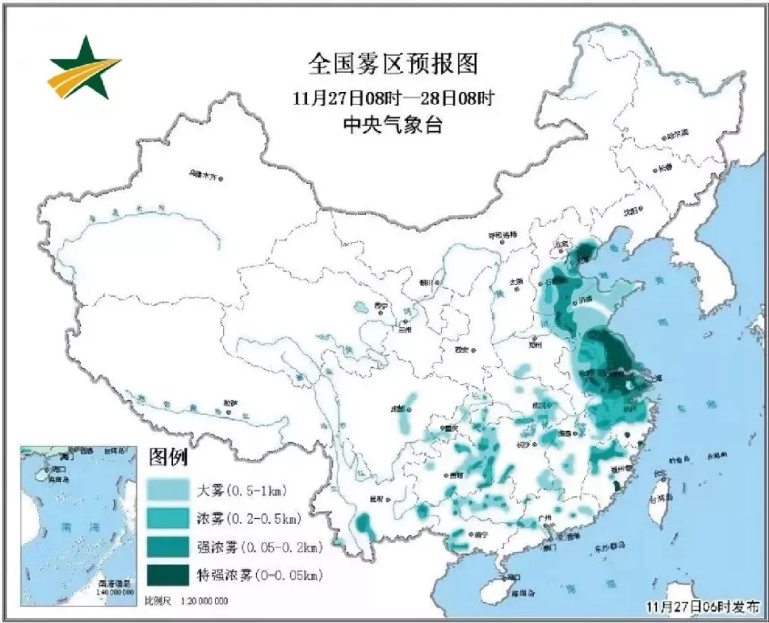 中央氣象臺(tái)11月27日06時(shí)繼續(xù)發(fā)布大霧橙色預(yù)警,27日早晨至28日早晨,華北中東部、黃淮東部和南部、江淮、江漢平原的部分地區(qū)將有大霧,其中河北東部、山東西南部、安徽東部、江蘇、上海、浙江北部等地有濃霧或強(qiáng)濃霧,局地有能見(jiàn)度不足50米的特強(qiáng)濃霧。預(yù)計(jì)華東地區(qū)的大霧天氣會(huì)一直持續(xù)到12月2日,長(zhǎng)達(dá)一周。