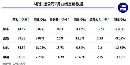 8月18日晚間,A股4家快遞公司發(fā)布7月業(yè)績,綜合各家披露的數(shù)據(jù)可以看到,快遞頭部企業(yè)的下半年業(yè)績競爭愈演愈烈,其中,申通快遞營收和業(yè)務(wù)量的增速繼續(xù)領(lǐng)先,圓通速遞穩(wěn)坐加盟制老二的寶座,韻達(dá)股份雖然業(yè)績難止下滑,但是其與申通的業(yè)務(wù)量差距正在拉大,追趕動作明顯。