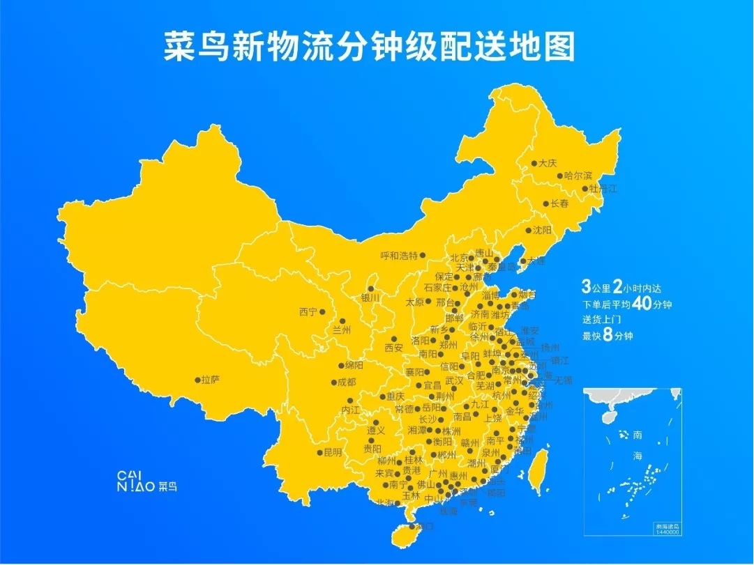 今年1月以來,菜鳥與天貓聯手商家及物流合作伙伴,共同推出門店發貨分鐘級配送服務,“網上下單、樓下發貨”,目前平均用時40分鐘,最快僅8分鐘就送貨上門。